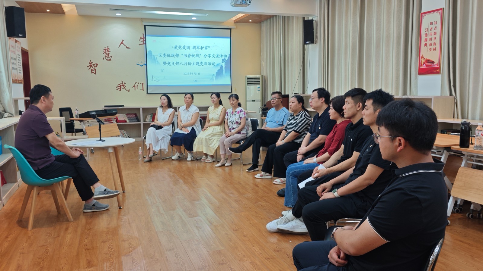8月1日,平顶山市新华区委统战部在区委党校开展“爱党爱国 拥军护家”——“书香统战”分享交流暨党支部八月份主题党日活动。区委统战部副部长王勇主持并做分享,部机关党员同志参加活动。