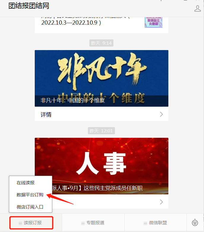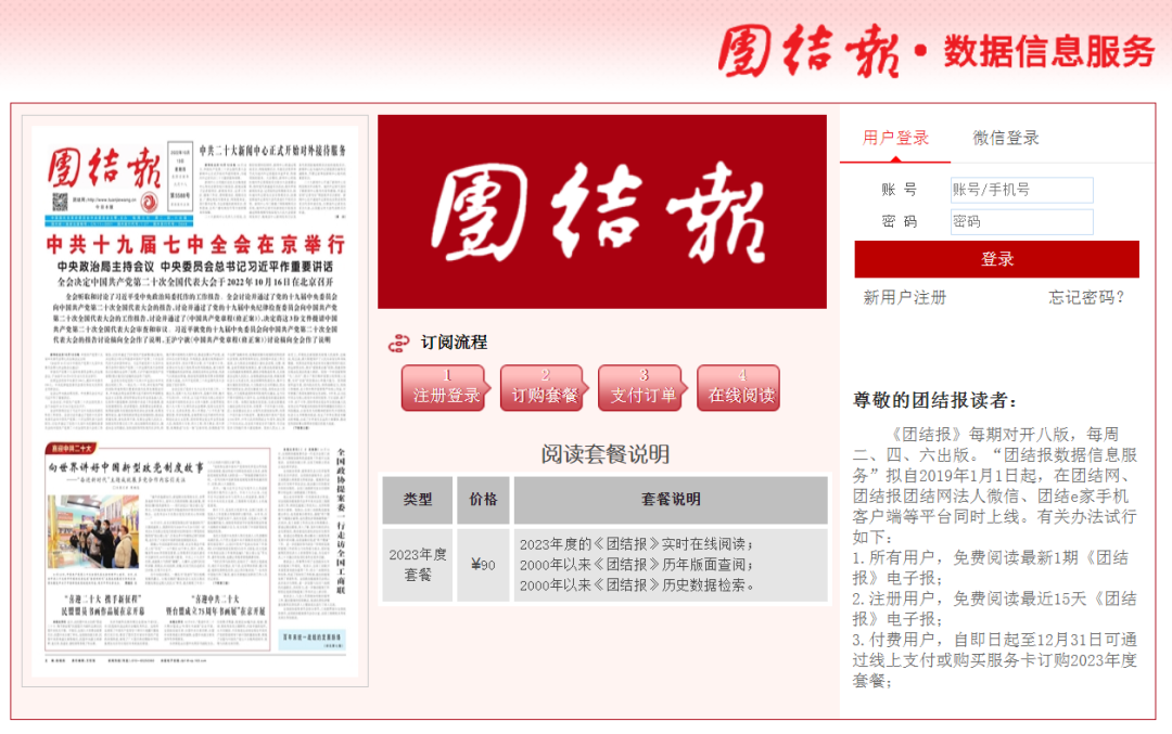 “团结报团结网”公众号首页——读报订报——数据平台订购——用户注册登入——订阅——在线订购或批量订购。